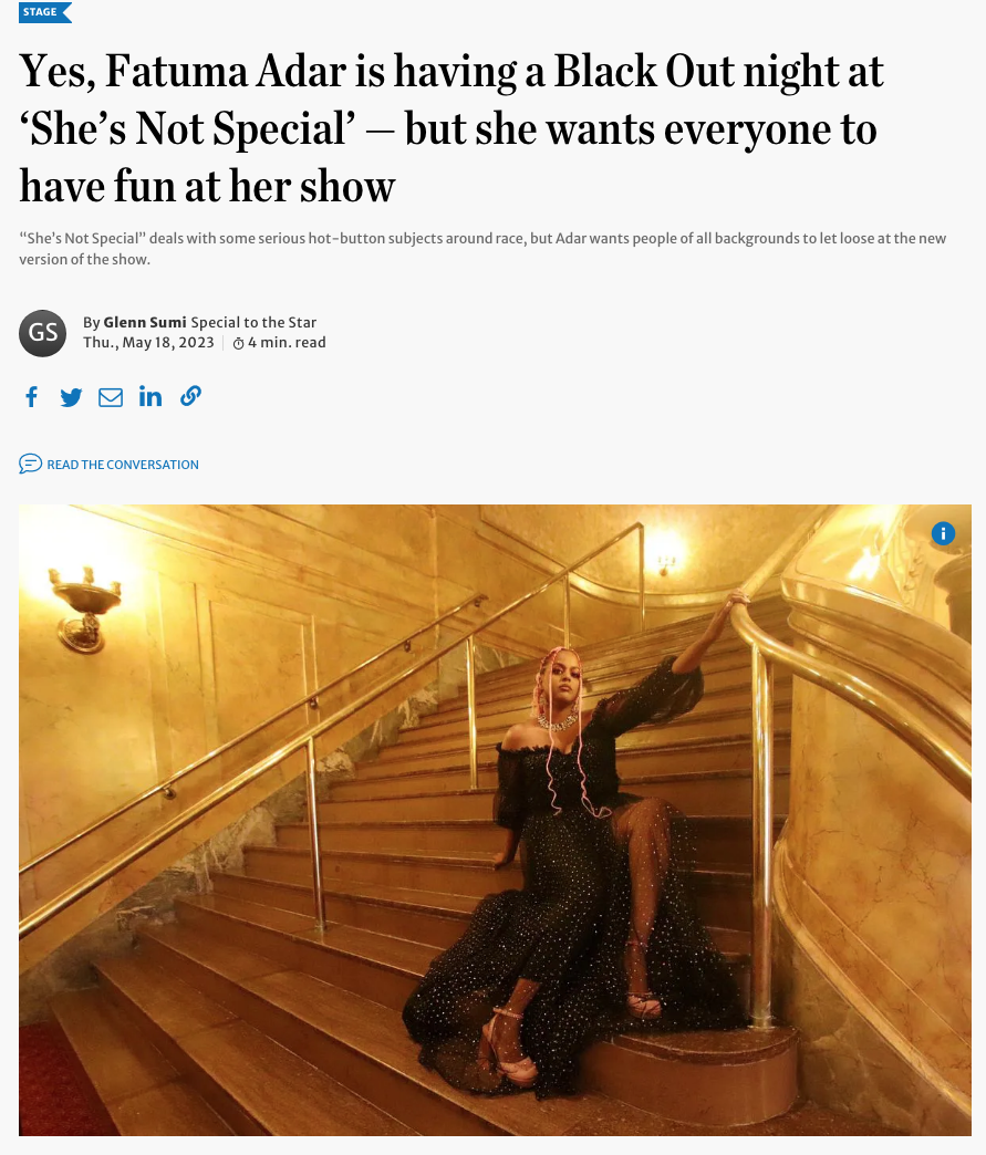 One of the most anticipated shows of the season is Fatuma Adar's She's Not Special, which hits the Tarragon this week after years of development. Last year she and co-director Graham Isador presented a film version of the show because of lockdown (I loved it); but now they're presenting the show the way they originally intended: as a live show/concert with stories and music.