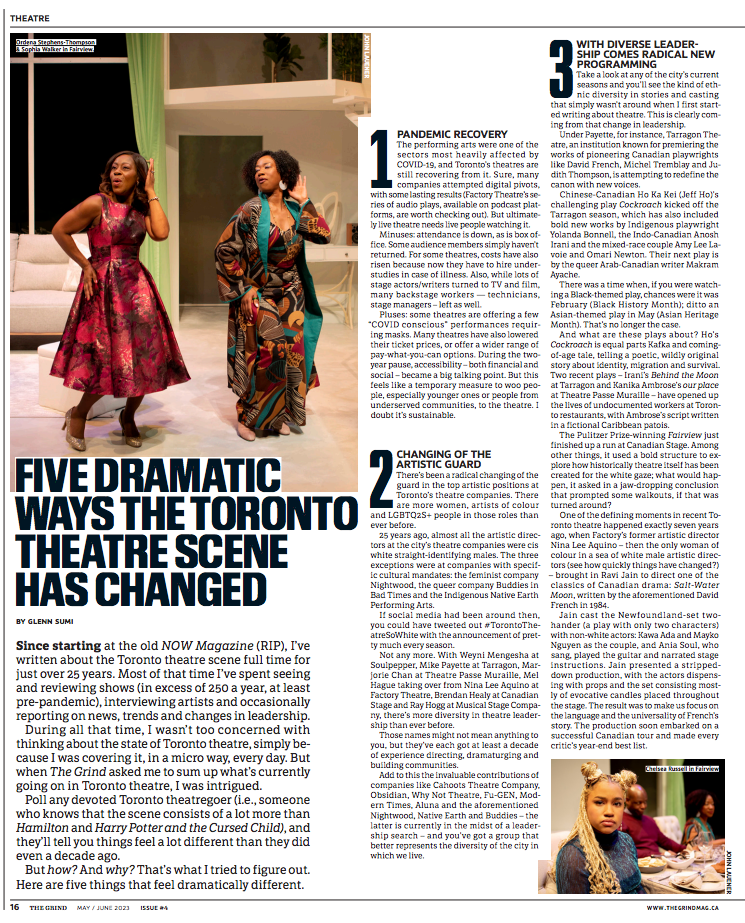 But when The Grind, Toronto's new independent politics and culture publication, asked me to write about how the city's theatre scene had changed, I jumped at the opportunity. You can find the print publication that includes the story at 250 locations, including book stores like Book City, Type Books and BMV, and many TTC subway stations.