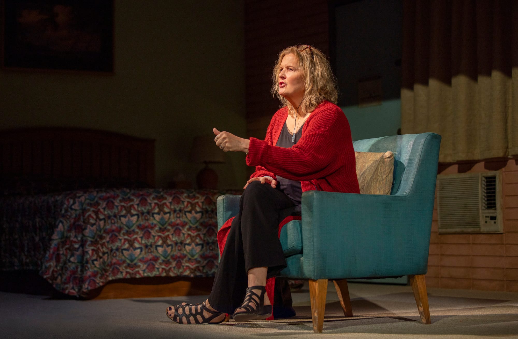 And lest you think the show simply consists of a woman sitting in a chair in a room for 75 minutes (I mean, it is that in one sense), two of the most unforgettable images show us something else. One consists of Dana looking out the curtains of her motel room – remembering her ordeal? Thinking of past and/or future escapes? The other is a quiet moment that cleverly indicates the passing of time but also does something more.