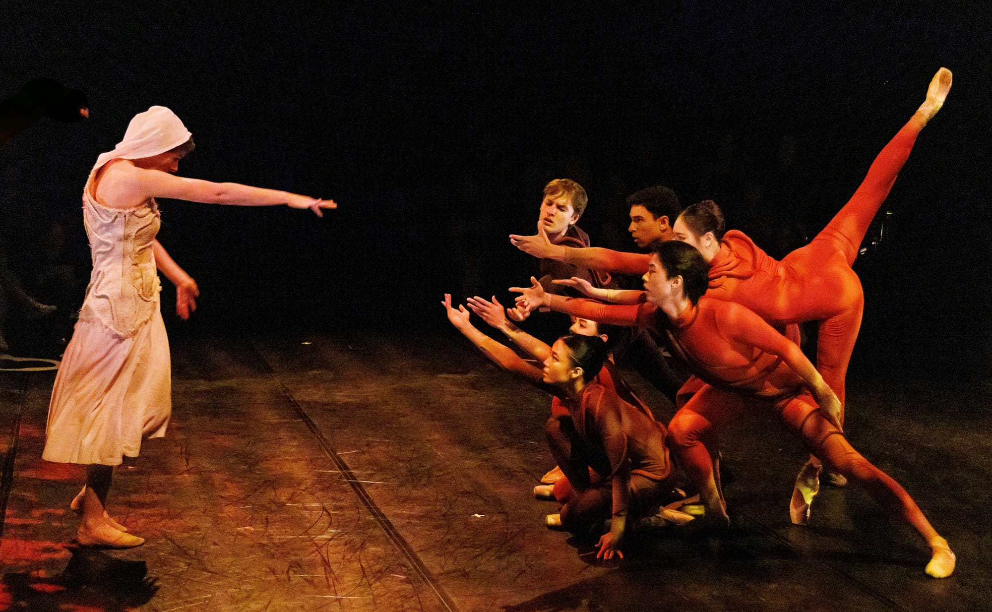 What we’re left with is a work with some fine production values. Nick Blais’ set and costumes, teased in a walkway from the lobby to the large Ada Slaight Hall at Daniels Spectrum (Q: Why isn’t this venue used more frequently?), is dominated by a large, shimmery chandelier/web that descends from on high to signify... something. The techie-mobile has been crafted with care. Dehbonehie has ensured that each group of characters — including an ensemble of apprentice dancers from the National Ballet, executing choreographer Robert Binet’s swirling moves — has a distinct, carefully curated look. And Heidi Chan’s sound design and compositions envelope the space in an effective way.