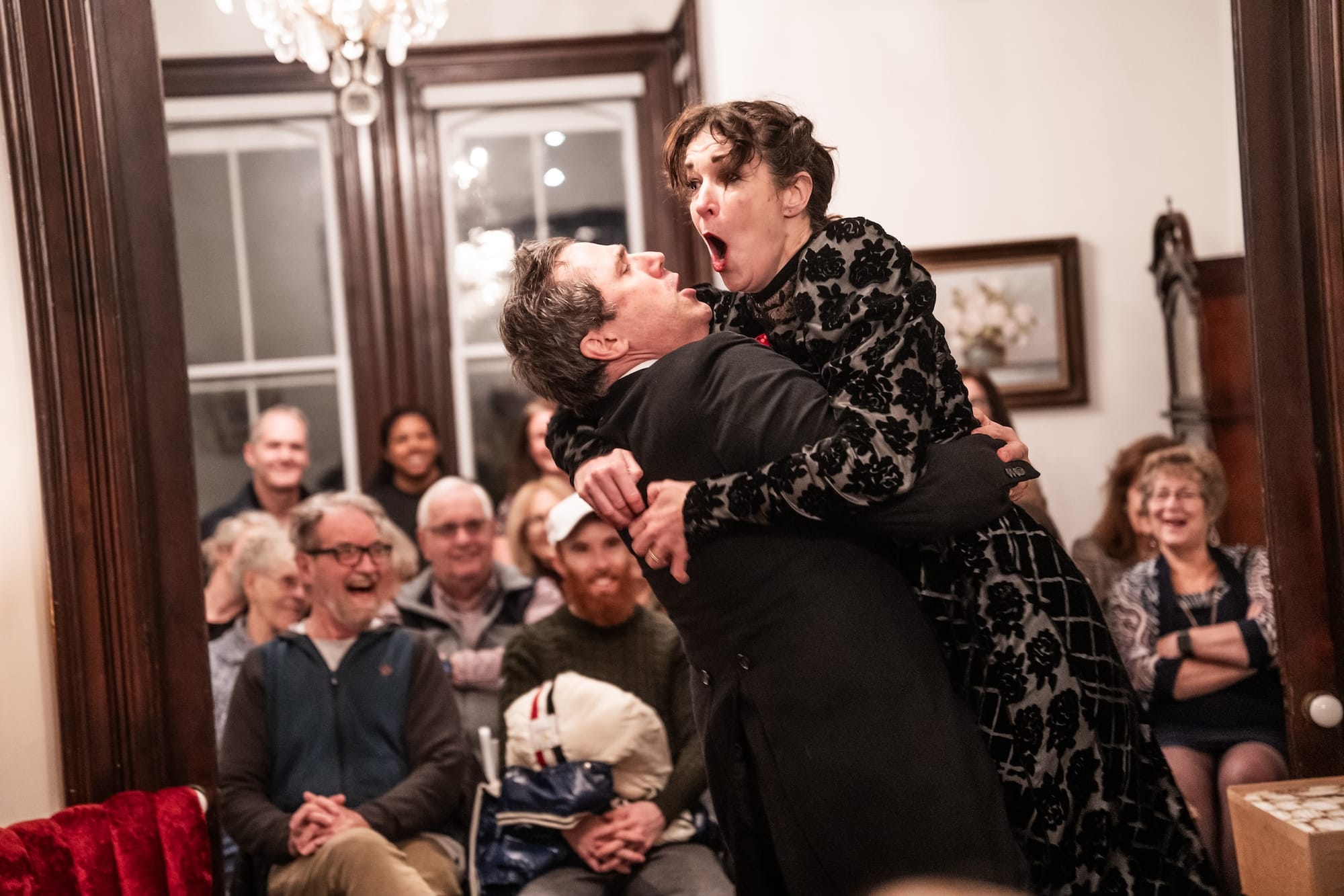 The production’s venue is the hallway of a suitably stately home, which conveniently comes with two sliding doors for parlours on either side (where the limited audience sits). What the venue loses in sightline visibility it more than makes up for in intimacy; since we’re in a home (set and costume design are by Varvara Evchuk), and all of the play takes place in that home, there’s an urgency and appropriateness to the proceedings. Having Zivka’s maid, Anka (Mariya Khomutova, the Dora-nominated co-writer/actor of First Métis Man of Odesa), open and close the sliding doors between scenes is a nice touch.