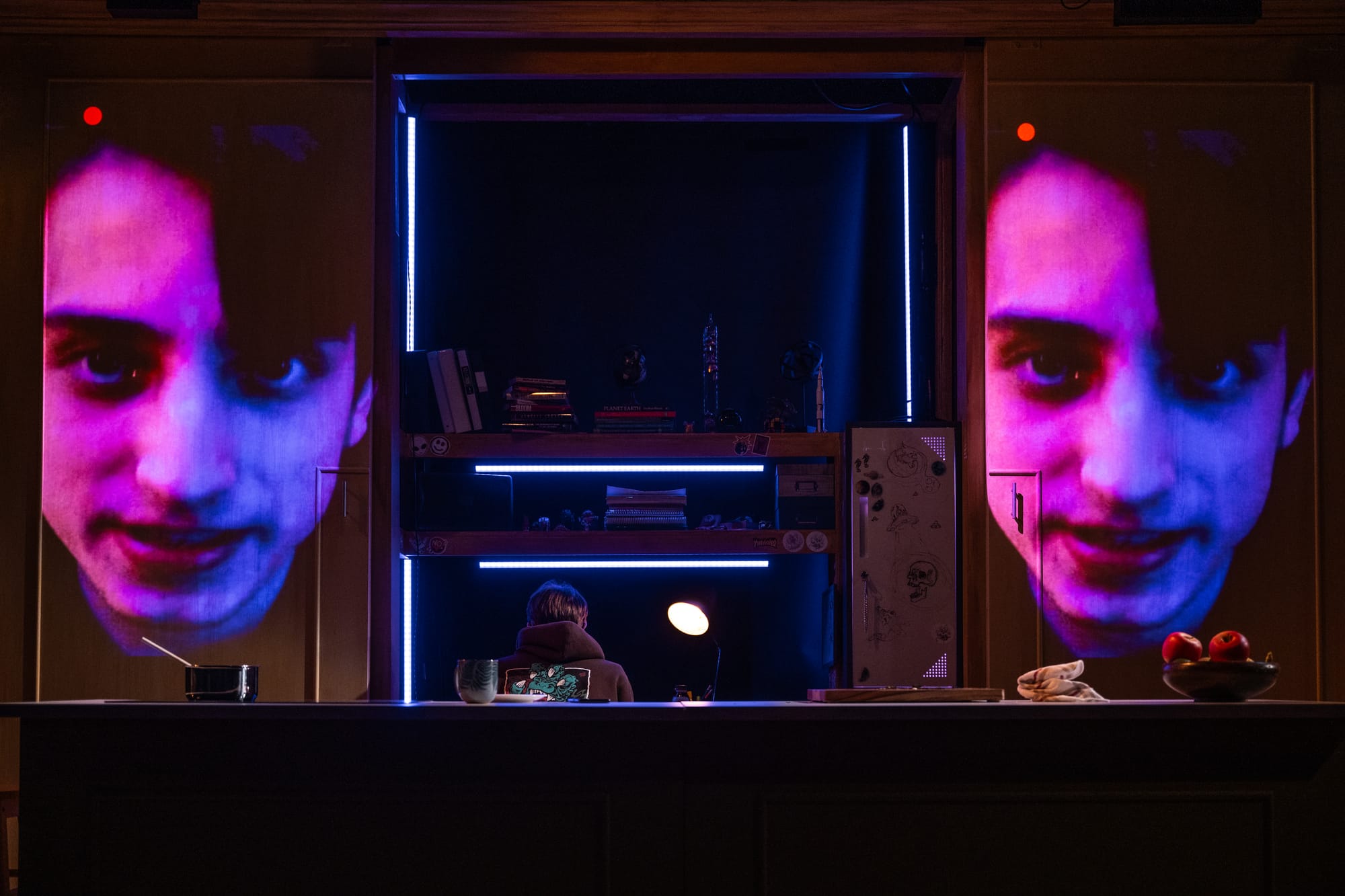 The back wall is filled with shelves, including two sliding cupboards that open to reveal Kit’s cramped, dark desk area, which suggests the secrets he’s been keeping from his mom. Tori Morrison’s video designs and Thomas Ryder Payne’s sounds are effectively integrated into the world of the show, whether showing us the food Bette is preparing, her show’s logo (which changes and has a different jingle midway through) or Kit’s confessional live streams, where he seems more himself than when he's talking to his mother.